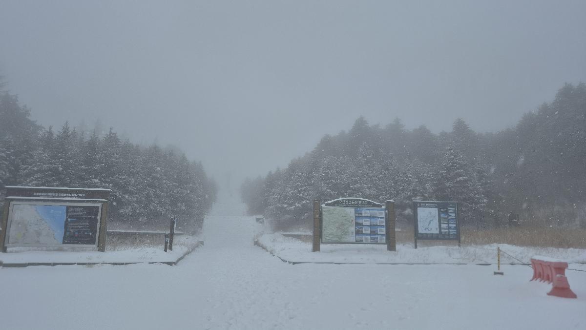 대관령숲길에 눈이 많이 오고 있습니다